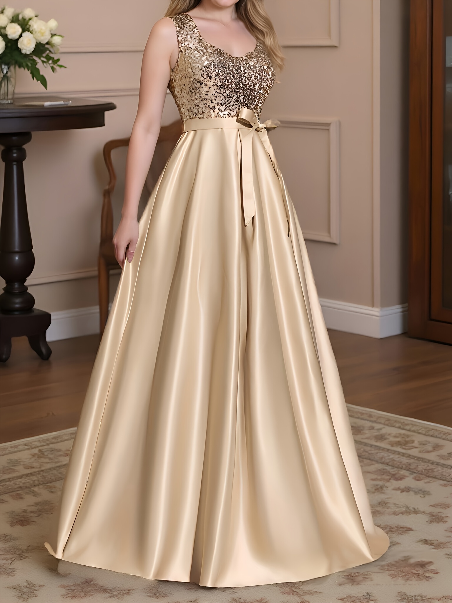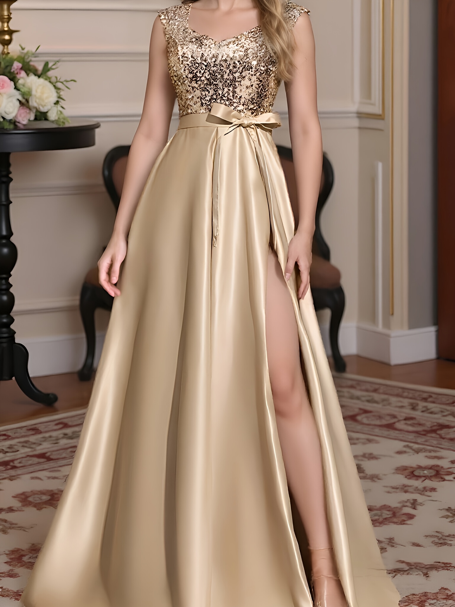 A formal evening gown with champagne colored elegant party sequins spliced high slit to the thigh back, a fashionable French wedding dress, suitable for party dinners/music performances/speech occasions, long dresses