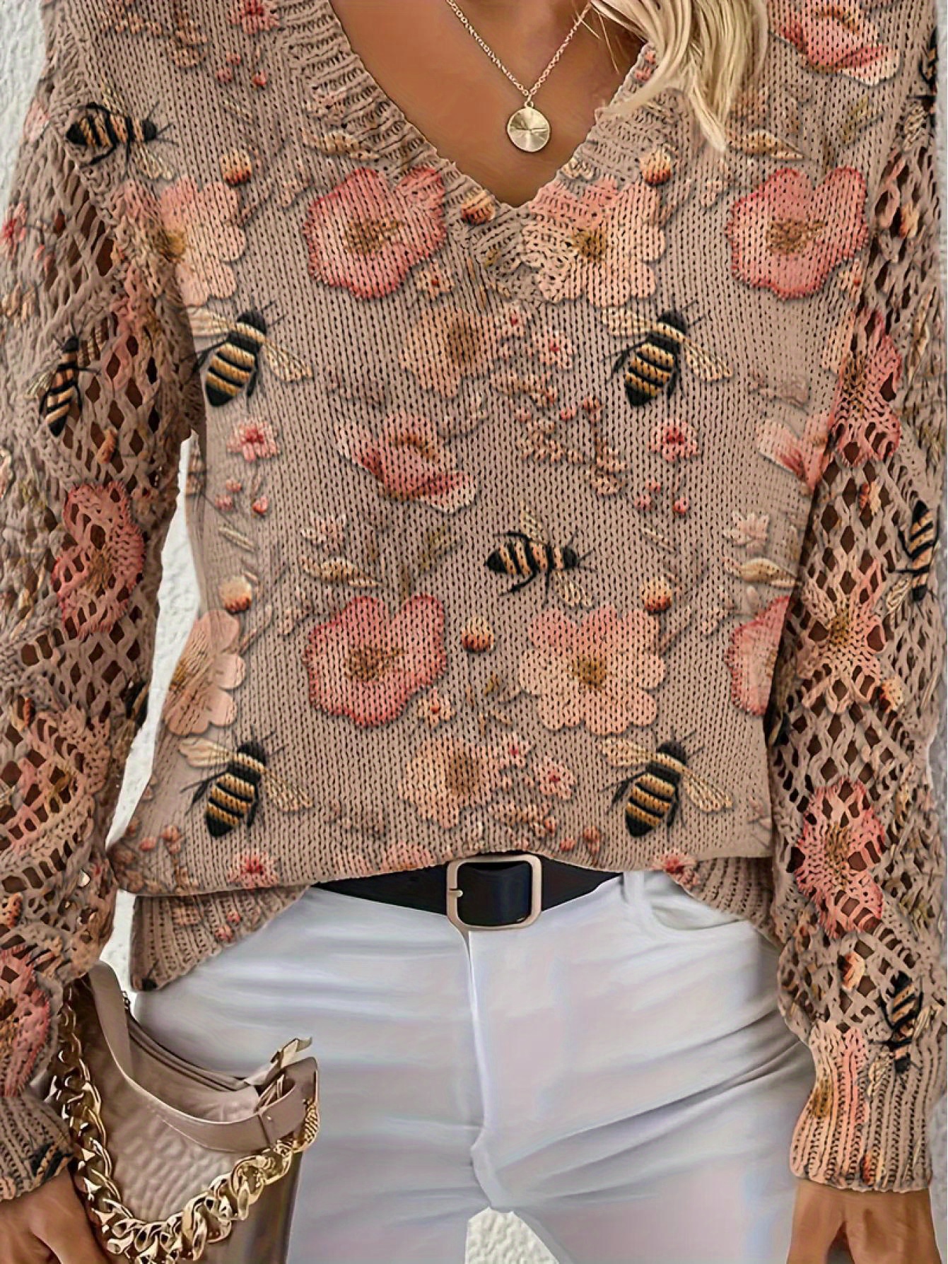 Elegant All-Season Bohemian Fashionable Versatile Pullover V Neck Long Sleeve Women's Top with Floral Pattern Flat Digital Print, Full-Piece Knitwear for Office Wear Street Style Home Outings