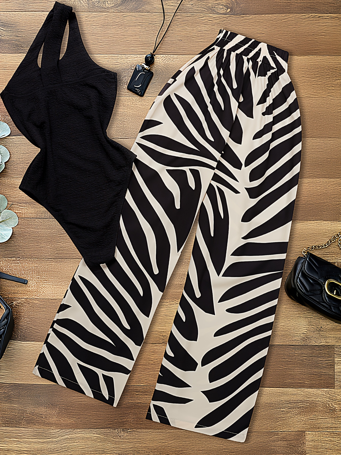Women's 2pcs Sleeveless Off-Shoulder High-Waisted Set - Black & White Geometric Zebra Stripe Wide-Leg Pants & Top, Non-Stretch Summer Outfit for Beach, Casual Semi-Formal Wear, 2pcs Outfit Set (No Accessories Included)