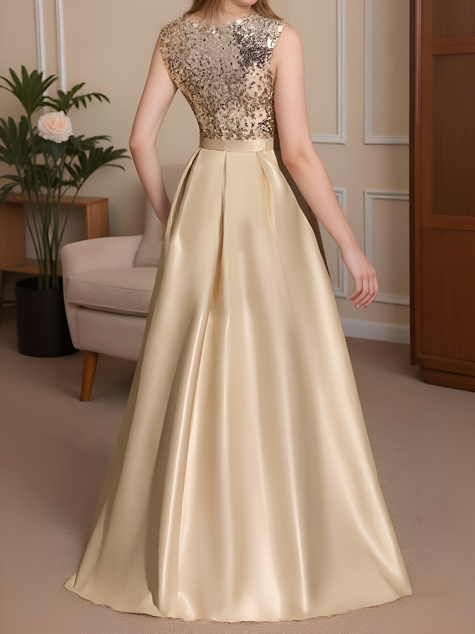 A formal evening gown with champagne colored elegant party sequins spliced high slit to the thigh back, a fashionable French wedding dress, suitable for party dinners/music performances/speech occasions, long dresses